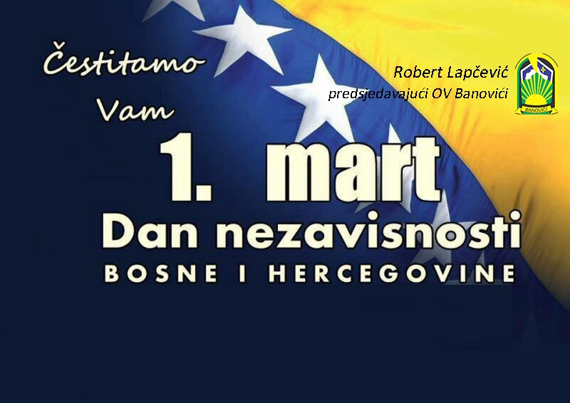 U ime Općinskog vijeća Banovići i svoje ime, građanima Banovića te svim Bosancim i Hercegovcima upućujem iskrene čestitke u povodu 1. marta – Dana nezavisnosti Bosne i Hercegovine.