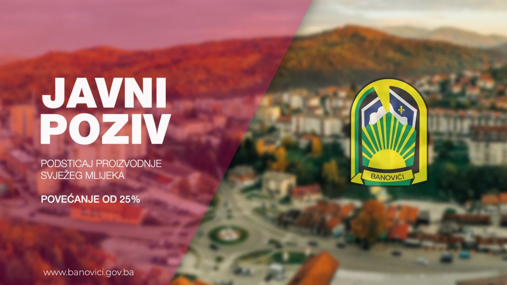 Na osnovu člana 70. Zakona o organizaciji organa uprave u Federaciji Bosne i Hercegovine („Službene novine F BiH “ broj: 35/05), člana 15. Zakona o principima lokalne samouprave u Federaciji Bosne i Hercegovine („Službene novine F BiH “ broj 49/06 ), člana 43.Statuta općine Banovići („Službeni Glasnik općine Banovići“ broj: 2/20 ), te na osnovu člana 4. Pravilnika o uslovima i načinu ostvarivanja prava za podsticaj proizvodnje svježeg mlijeka u 2025. godini, broj: 01-04-1014/25 od 04.04.2025. godine općinski Načelnik raspisuje: