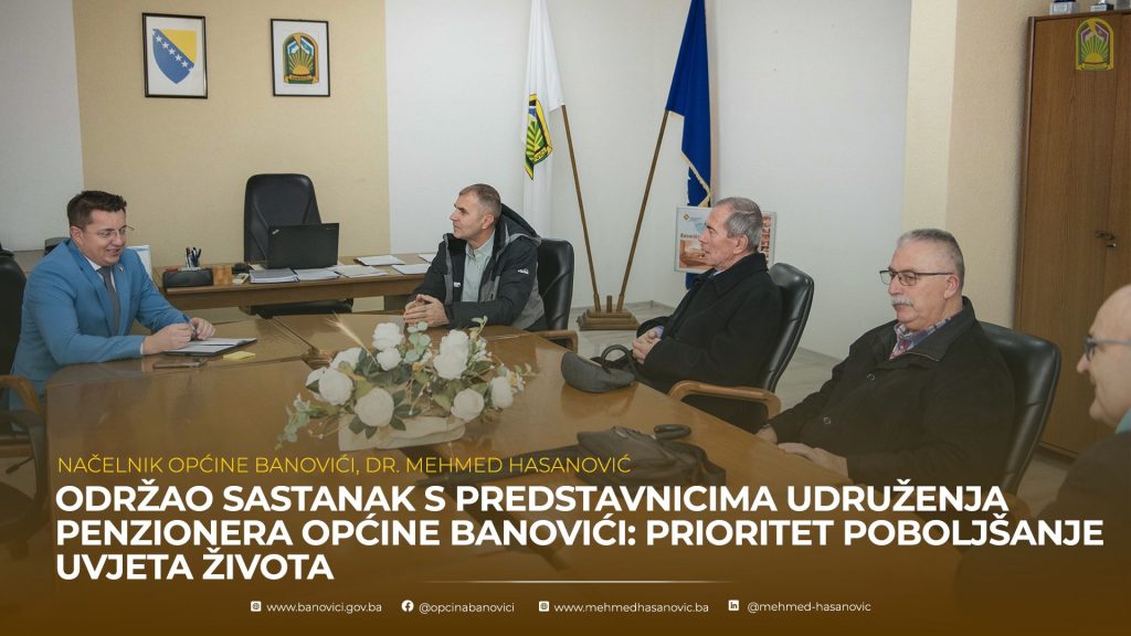 Načelnik Općine Banovići, dr. Mehmed Hasanović, održao je sastanak s predstavnicima Udruženja penzionera Općine Banovići. Na sastanku se razgovaralo o aktuelnim pitanjima koja se tiču penzionera, njihovih potreba i izazova s kojima se susreću.