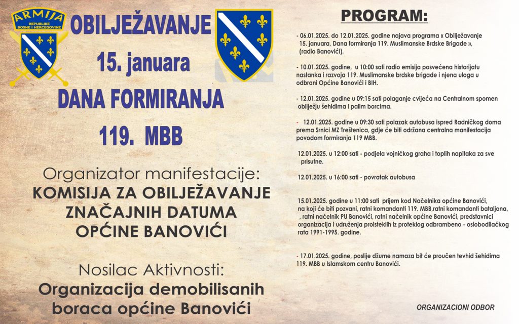 - 12.01.2025. godine u 09:30 sati polazak autobusa ispred Radničkog doma prema Srnici MZ Treštenica, gdje će biti održana centralna manifestacija povodom formiranja 119 MBB.