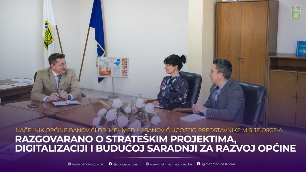 Danas je Općinu Banovići posjetila delegacija predstavnika misije OSCE-a, koju je ugostio načelnik Općine, dr. Mehmed Hasanović. Na sastanku su razmatrane ključne teme vezane za budući razvoj općine, sa posebnim fokusom na reformu javne uprave, digitalizaciju i implementaciju e-uprave, čiji je cilj unaprijediti efikasnost administracije i poboljšati usluge građanima.