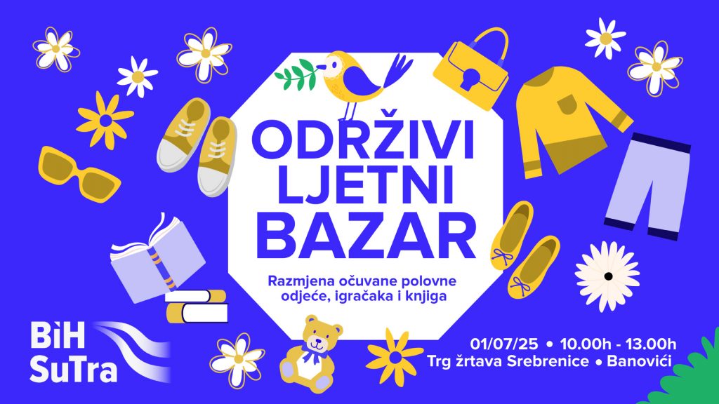 Pozivamo vas da nam se pridružite na Održivom ljetnom bazaru u Banovićima – zajedničkom događaju posvećenom održivoj modi, ljubavi prema knjigama i odgovornom pristupu dječijim igračkama. Pridružite nam se u utorak, 1. jula 2025. godine, na Trgu žrtava Srebrenice u Banovićima, od 10:00 do 13:00 sati, na inspirativnom događaju razmjene koji promoviše održivost i smanjenje otpada.